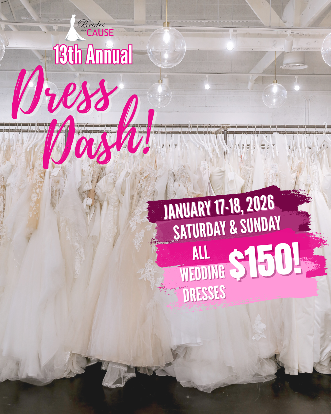 Our 13th Annual Dress Dash is taking place at our Brides for a Cause boutiques on January 17-18, 2026!